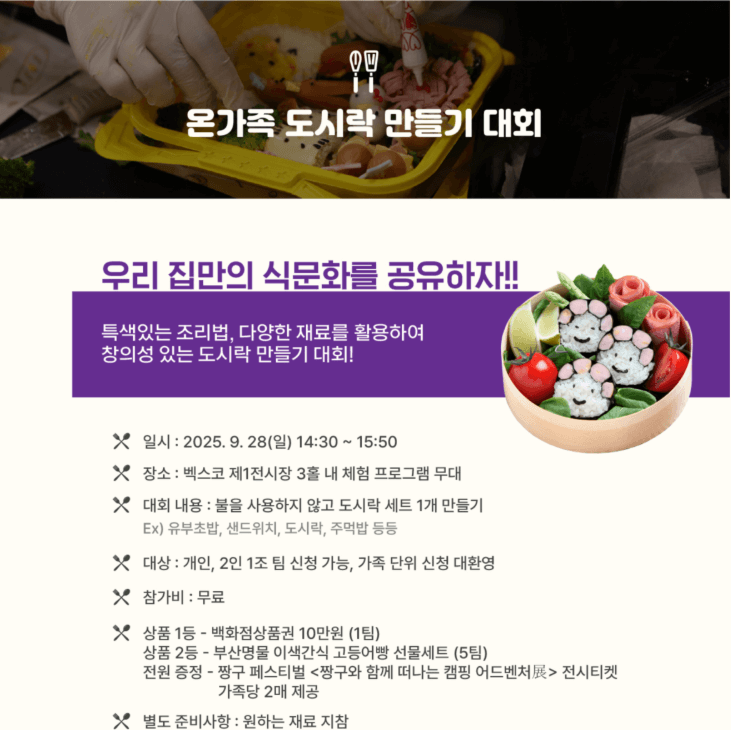 • 외국인을 대상으로 하는 ‘김밥 만들기 대회’와 온 가족이 함께하는 ‘도시락 만들기 대회’가 운영될 예정입니다. 각 대회는 현장 참여 및 사전 신청으로 진행되며, 다양한 재료와 재미난 미션으로 특별한 추억을 남길 수 있습니다.