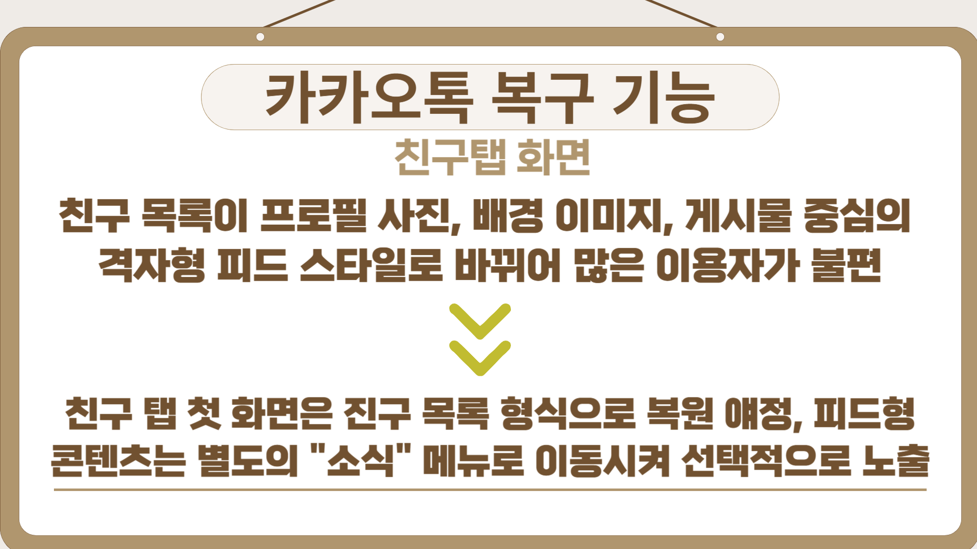 지난 카카오톡 업데이트 이후 친구목록이 피드형으로 바뀌어, 게시물이 친구탭에 쏟아지면서 불편함을 느꼈던 이용자들이 많았습니다. 이번 개선안에 따라 친구목록이 다시 기존의 리스트 방식으로 복원되고, 게시물과 사진 등 SNS 스타일 피드 콘텐츠는 별도 소식 탭으로 분리됩니다.