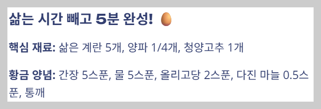 - **핵심 재료:** 삶은 계란 5개, 양파 1/4개, 청양고추 1개