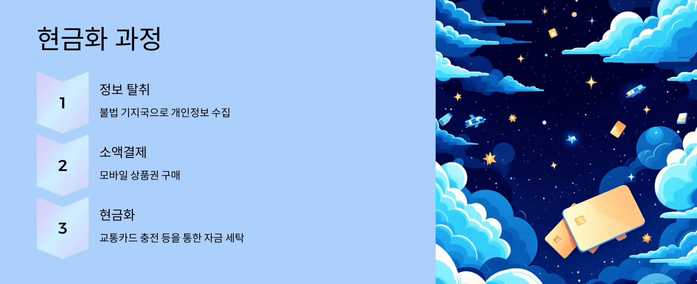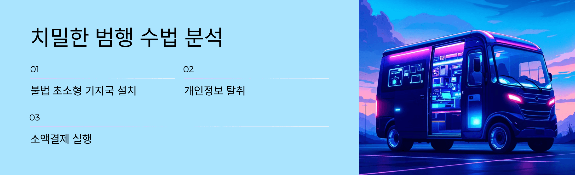 해당 기지국을 통해 특정 장소에서 다수의 휴대폰과 신호를 주고받으며, 모바일 상품권 구매나 교통카드 충전 등 현금화가 가능한 결제를 대량으로 실행한 방식이 드러났습니다. 이번 사건은, 해외 조직의 지휘 아래 계획적으로 해킹/금전 탈취가 이루어진 구조임을 보여줍니다.