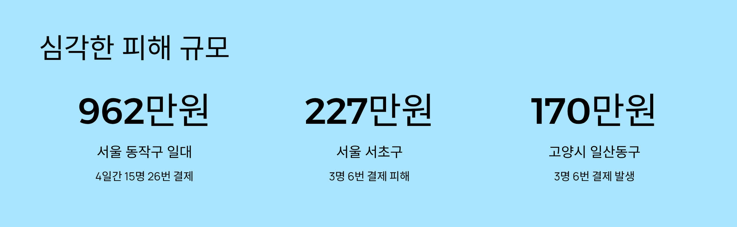 - 지난달 5~8일 서울 동작·관악·영등포구에서 15명이 26번이나 결제가 강제 발생해 약 962만 원 피해